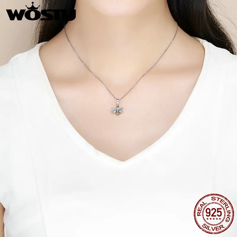 New WOSTU 925 Sterling Silver Hot Sell Bee Crystal CZ Chain Bead Charms fit Bracelet Necklace 2019 Fash